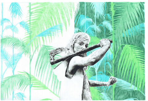 Je me suis toujours interrogée sur la sémantique du terme jungle urbaine, l’association de ces deux termes qui sous-entend la force, la brutalité d’une part, l’expérience d’un paysage luxuriant et végétal de l’autre. Qui sont les personnages de la jungle urbaine ? Comment vit-on la ville sans famille, sans toit ou sans argent ? La jungle urbaine est pour moi un imaginaire kaléidoscopique où défilent des personnages qui forment la ville sur fond de forêt amazonienne, de déserts de cactus ou de palmeraie sauvage. Résultant de l'accélération du temps et du rétrécissement de l'espace, dus à l'invention des moyens de télécommunication et de transports modernes, la jungle urbaine est une ville virtuelle déterritorialisée par la mondialisation. Inspirée par les voyages, j’ai découvert de nouvelles possibilités de recherche technique autour d’une nature fantasmagorique et fantasmée. Explorer de nouvelles possibilités de couleurs en intégrant la nature dans mon travail est apparu comme une évidence. Dans cette recherche m’est venue la volonté de superposer mes sujets de prédilection, issus de la mythologie urbaine, à des décors végétaux.